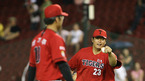 2007 프로야구 LG 트윈스와 KIA 타이거즈의 경기가 15일 잠실야구장에서 벌어져 KIA가 조경환의 4타점과 스코비의 6이닝 무실점 호투로 4-2로 승리를 거두었다. LG의 마지막 타자 조인성을 잡고 경기를 마무리한 한기주에게 최희섭이 수고했다고 손짓 하고 있다./잠실=손용호 기자spjj@osen.co.kr <2007 삼성 PAVV 프로야구>...