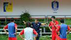 오는 17일 열리는 2010 남아공 월드컵 아시아 최종예선 이란과의 마지막 경기를 앞둔 축구 국가대표팀이 14일 파주 NFC에서 훈련 및 미디어데이 행사를 가졌다. 허정무 감독이 훈련에 앞서 스트레칭으로 몸을 풀고 있는 선수들을 바라보고 있다./파주=김영민 기자ajyoung@osen.co.kr