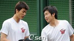 '2009 CJ 마구마구 프로야구' SK 와이번스와 한화 이글스의 경기가 30일 오후 인천문학구장에서 벌어진다. 경기에 앞서 훈련을 하던 SK 김광현과 송은범이 대화를 나누고 있다./문학=윤민호 기자ymh@osen.co.kr