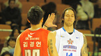 [OSEN=잠실실내체,지형준 기자] 29일 오후 서울 잠실 실내체육관에서 열린 2011 현대모비스 프로농구 올스타전 '루키 챌린지' 경기에 앞서 SK 김경언이 덩크 콘테스트 예선전을 마치고 삼성 이승준과 하이파이브를 하고 있다. /jpnews@osen.co.kr