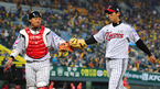 [OSEN=잠실,지형준 기자] 22일 오후 서울 잠실구장에서 열린 '2011 롯데카드 프로야구' LG 트윈스와 KIA 타이거즈의 경기, 2회초 수비를 마친 LG 조인성과 김광삼이 서로를 격려하며 더그아웃으로 향하고 있다./ jpnews@osen.co.kr