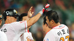 [OSEN=문학, 민경훈 기자] 3일 오후 문학 구장에서 '2011 롯데카드 프로야구' SK 와이번스와 LG 트윈스의 경기가 열렸다.이 날 경기에서 SK는 9회말 이호준의 끝내기 투런포에 힘입어 5-4로 LG에 역전승을 거뒀다. SK 이호준이 끝내기 홈런을 날린 후 동