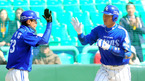 [OSEN=인천,박준형 기자]20일 오후 인천 문학구장에서 열린 SK 와이번스와 삼성 라이온즈의 시범경기 6회초 삼성 선두타자 채상병이 솔로홈런을 날린후 김재걸 코치와 하이파이브를 하고 있다. 이날 경기에서 SK는 로페즈를, 삼성
