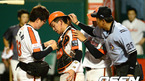 [OSEN=대전, 이대선 기자] 29일 오후 대전 한밭야구장에서 열린 '2012 팔도 프로야구' 한화 이글스와 넥센 히어로즈의 경기, 5회초 2사 1,3루 넥센 이성열 타석때 한화 바티스타의 투구를 맞은 포수 이준수가 트레이너의 치료를 받고