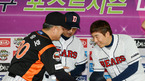 [OSEN=잠실, 민경훈 기자] 7일 오후 서울 잠실구장에서 진행된 2012 팔도프로야구 준플레이오프 미디어데이에서 롯데 강민호와 두산 김현수가 악수를 나누고 있다. 이날 미디어데이에는 두산 김진욱과 롯데 양승호 감독이 참석해