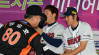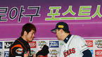 [OSEN=잠실, 민경훈 기자] 7일 오후 서울 잠실구장에서 진행된 2012 팔도프로야구 준플레이오프 미디어데이에서 롯데 양승호 감독이 두산 이용찬과 악수를 나누고 있다. 이날 미디어데이에는 두산 김진욱과 롯데 양승호 감독이 참