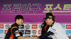 [OSEN=잠실, 민경훈 기자] 7일 오후 서울 잠실구장에서 진행된 2012 팔도프로야구 준플레이오프 미디어데이에서 롯데 강민호가 두산 이용찬에게 장난을 치고 있다. 이날 미디어데이에는 두산 김진욱과 롯데 양승호 감독이 참석해