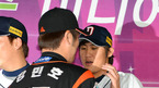 [OSEN=잠실, 민경훈 기자] 7일 오후 서울 잠실구장에서 진행된 2012 팔도프로야구 준플레이오프 미디어데이에서 두산 이용찬의 말에 김현수가 환하게 웃고 있다. 이날 미디어데이에는 두산 김진욱과 롯데 양승호 감독이 참석해 1