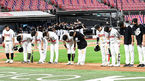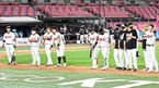 [OSEN=수원, 민경훈 기자] 25일 오후 경기도 수원시 수원kt위즈파크에서 ‘2021 신한은행 SOL KBO 리그’ KT 위즈와 LG 트윈스의 경기가 열렸다.이 날 경기에서 양 팀은 0-0 무승부를 기록했다.경기를 마치고 양팀 선수들이 인사를