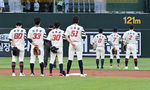 [OSEN=부산, 이석우 기자] 26일 부산 사직야구장에서 2025 신한 SOL 뱅크 KBO 리그 롯데 자이언츠와 KT 위즈의 경기가 열렸다. 홈팀 롯데는 나균안이, 방문팀 KT는 오원석이 선발 출전했다.롯데 자이언츠 야수들이 국민의례를 하고 있