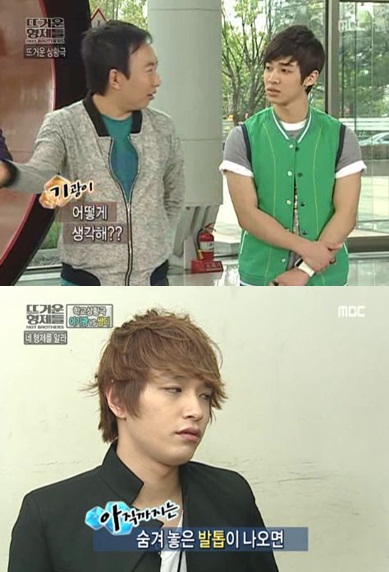 [OSEN=정덕현의 네모난 세상] '뜨거운 형제들'이 서 있는 지점은 가상과 현실 사이의 경계지대다. '뜨거운 형제들'이라는 타이틀 아래 형제들(?)은 인위적으로 구성되었다. 그 인위성은 김구라와 박명수 같은 좀체 어울릴 것 같지 않은 강한 캐릭터가 한 자리에 서 있는 것만 봐도 쉽게 알 수 있다. 여기에 노련하고 재기발랄한 탁재훈과 의외로 진지한(?) 박휘순, 의외로 허술한 노유민도 독특하고, 예능 신상으로서의 새로운 캐릭터를 만들어가는 한상진이나 사이먼D, 이기광이라는 조합도 낯설다. 이 어색한 느낌의 구성만으로 보면 이 프로그램은 마치 김구라가 진행했던 '절친노트'의 초반 시절을 연상시킨다.