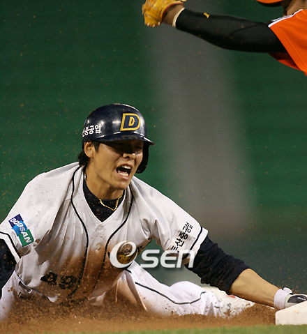 12일 잠실구장에서 벌어진 2007 프로야구 두산 베어스와 한화 이글스의 경기는 두산 김동주의 악송구로 승패가 갈렸다. 1-1이던 한화의 9회초 2사 후 백재호의 3루 깊은 땅볼을 잡은 김동주가 1루에 원바운드로 송구한 것을 1루수 정원석이 잡지 못하고 뒤로 빠트려 한화가 2-1로 이겼다. 두산의 7회말 2사 2루서 민병헌이 3루 도루를 시도했으나 아웃 당하고 있다./잠실=손용호 기자spjj@osen.co.kr
