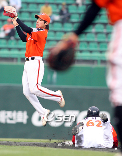 단 1개의 도루 시도도 없었다. 그러나 한화는 SK의 기동력에 무너져내렸다. 지난 22일 문학구장에서 열린 SK-한화전은 양 팀 사령탑인 김성근-김인식 두 지략가의 수싸움으로 불꽃을 튀겼다. 그리고 그 승부는 6회말에 가려졌다. 2-3으로 역전당한 직후, SK는 선두타자 박재상이 한화 구원투수 양훈의 초구를 받아쳐 좌전안타를 치고 출루했다. 이후 양훈은 후속 김재현에게 연속 볼 3개를 던지더니 볼넷을 내줘 패배의 빌미를 제공했다. 이어 등장한 4번타자 박경완은 양훈의 초구 때 번트 모션 뒤 버스터를 감행했다. 버스터와 동시에 주자들은 더블 스틸을 시도했다. 파울이 됐으나 김성근 감독의 '깜짝 작전'이었다. 그리고 박경완은 또다시 의표를 찔러 2구째에 강공을 펼쳐 143km 직구를 제대로 받아쳐 동점 중전 적시타를 만들어냈다. 그러자 김인식 감독은 5번 정근우 타석 때 두 차례나 연속으로 피치아웃을 시켜 주자를 견제했다. 결국 정근우를 연속 번트 실패 뒤 삼진으로 돌려세우는 데까지는 성공했다. 그러나 박정권-박재홍에게 연속 2루타를 얻어맞고 흐름을 빼앗겼다. 결과적으로 김성근 감독의 잽에만 대비하다 카운터 펀치를 맞아버린 한화였다. 아울러 팀 도루 28개의 SK가 모션만으로 한화 배터리를 흔들어버린 '기록에 안 나오는' 기동력의 승리였다. sgoi@osen.co.kr 지난 21일 문학 SK-한화전.