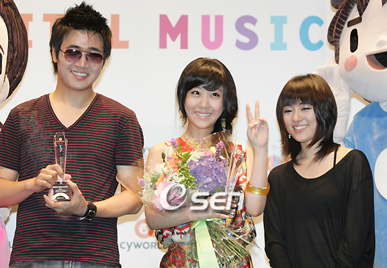 싸이월드 미니홈피 배경음악으로 1달간 가장 많은 판매를 올린 곡과, 두드러진 성장을 보인 신인에게 수상하는 '디지털 뮤직 어워드' 시상식이 19일 압구정 cgv에서 열렸다. 'Song Of The Month' 수상자는 5집 앨범을 들고 6년만에 컴백한 의 양파와 'Rookie Of The Month'에는 UCC스타인 의 1sagain이 선정됐다. 양파와 1sagain이 수상 후 기념촬영을 하고 있다. /황세준 기자 storkjoon@osen.co.kr