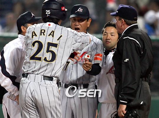 실낱같이 남아있던 한국의 베이징 올림픽 본선 직행 꿈이 무산됐다. 김경문 감독이 이끄는 한국 야구대표팀은 3일 타이중 인터콘티넨탈 구장에서 약체 필리핀을 상대로 13-1, 7회 콜드게임 승리를 거뒀다. 이로써 아시아 예선전 종합전적 2승 1패에 실점 6점(일본전 4실점-대만전 2실점)을 남긴 한국은 대만-일본전 경기 결과에 마지막 희망을 걸었으나 일본이 10-2로 재역전승하며 올림픽 티켓을 잃게 됐다. 일본이 대만 상대로 6회말까지 1-2로 뒤질 때만 해도 한국의 가능성은 살아있었다. 그러나 일본은 역전당한 직후인 7회초 공격에서 얄미울 정도로 정교한 단타 야구를 선보이며 무려 6점을 뽑아냈다. 에이스 다르빗슈는 6회 대만 4번타자 천진펑에게 우중월 2점홈런을 얻어 맞았으나 5회까지 단 1안타밖에 내주지 않는 등 7이닝 2실점으로 승리를 따냈다. 일본은 1회 4번타자 아라이의 적시타로 선취점을 얻었고, 7회 무사 만루에서 사부로의 스퀴즈 번트가 성공하며 2-2 동점을 만들어냈다. 이어 니시오카의 역전 적시타와 가와사키-아라이-아베의 연속 적시타로 순식간에 6점을 뽑아내며 대세를 굳혔다. 일본은 9회에도 아라이의 2점홈런과 미야모토의 적시타로 3점을 더 달아났다. 호시노 일본 감독은 다르빗슈에 이어 8회 후지카와-9회 우에하라를 올려 베이징 가는 길을 확고히 했다. 이로써 일본은 필리핀(10-0) 한국(4-3) 대만(10-2) 상대로 전승을 거두고 제24회 아시아 선수권 우승과 동시에 베이징 올림픽행을 확정지었다. 반면 한국은 2위에 머물며 내년 3월 열릴 세계 예선전(개최지 대만)을 통해서 올림픽 티켓 재도전에 나서게 됐다. 3위 대만 역시 세계 예선전 출전 자격을 얻었다. 세계 예선전은 8개 참가국 가운데 3위 안에 들어가는 나라에 올림픽 티켓을 부여한다. sgoi@osen.co.kr 호시노 일본 대표팀 감독이 1회 2사 3루서 아라이가 투구에 맞았으나 파울로 선언되자 덕아웃에서 나와 항의하고 있다. 아라이는 다시 타석에 서 선제 적시타를 터뜨렸다. /타이중=손용호 기자 spjj@osen.co.kr.