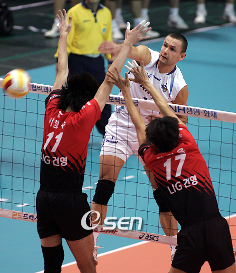 신치용 감독이 이끄는 대전 삼성화재 블루팡스가 LIG손해보험을 꺾고 5연승 행진을 이어갔다. 16일 대전 충무 체육관에서 열린 NH농협 2007-2008 V리그 남자부 1라운드 경기에서 삼성화재는 LIG손보를 세트 스코어 3-0(25-22 25-19 25-20)으로 완파, 5전 전승으로 1라운드를 마치게 됐다. LIG손보는 3승 2패. 첫 세트부터 삼성화재의 막강한 화력이 불을 뿜었다. 좌우 쌍포 안젤코와 장병철의 화끈한 강타로 기세를 올린 삼성화재는 박빙의 랠리에서 좀처럼 리드를 내주지 않고, 앞서나갔다. 안젤코와 센터 신선호의 연속 속공, 장병철의 침착한 공격으로 포인트를 올린 삼성화재는 12-10까지 추격을 허용했으나 이후부터 착실히 점수를 더해가며 기선을 제압했다. 라이트 팔라스카의 스파이크가 네트에 걸리며 불안한 출발을 보인 LIG손보는 레프트 이경수의 오픈 공격과 센터 하현용의 블로킹으로 추격을 시도했으나 잦은 범실로 좀처럼 위기를 탈출하지 못했다. 결국 1세트는 삼성화재의 몫. 두 번째 세트에서도 흐름은 비슷했다. 삼성화재는 레프트 콤비 안젤코와 김정훈이 활발한 공격을 전개하며 초반 분위기를 잡아나갔다. LIG손보도 9-10까지 추격을 시도했지만 그 뒤로는 내리 삼성화재의 일방적인 공격이 이뤄졌다. 삼성화재는 센터 고희진이 절묘한 속공으로 2점차로 벌리며 위기를 탈출했고, 점수를 더해 승기를 잡았다. 삼성화재는 장병철의 연타와 안젤코의 한 템포 빠른 공격으로 세트를 마무리, 세트 스코어를 2-0까지 벌려놓았다. 마지막 3세트에서도 삼성화재의 기세는 멈추지 않았다. 언제나처럼 세트 초반에는 양 팀이 팽팽한 랠리를 이어갔으나 중반부터 삼성화재의 매서운 공격이 불을 뿜었다. 안젤코가 날렵한 몸놀림으로 백어택을 때리고 고희진의 오픈 공격이 연이어 성공되자 삼성화재는 단숨에 기세를 올리며 점수차를 벌려 승리를 확정지을 수 있었다. LIG손보는 디펜스 불안과 잦은 공격 실책으로 추격에 실패, 역시 단 한 번도 리드를 잡아보지 못한 채 무릎을 꿇고 말았다. yoshike3@osen.co.kr 삼성화재 안젤코가 상대의 블로킹 사이로 스파이크를 성공시키고 있다. /대전=황세준 기자 storkjoon@osen.co.kr