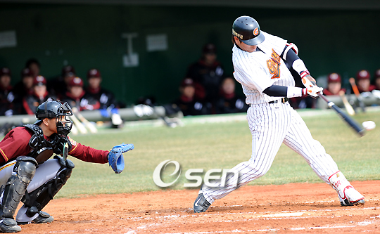 신생구단 우리 히어로즈가 팀 창단 후 공식경기에서 첫 승을 신고했다. 히어로즈는 9일 부산 사직구장에서 열린 시범경기 2일째 롯데와의 경기에서 오윤의 홈런포 등에 힘입어 3-2로 역전승을 거뒀다. 히어로즈는 0-2로 뒤진 7회초 공격서 오윤의 동점 투런 홈런과 황재균의 결승타에 힘입어 3-2로 경기를 뒤집었다. 전날 패배를 설욕하며 시범경기 2경기 만에 첫 승을 올렸다. 히어로즈는 선발 마일영이 3이닝 2피안타 무실점으로 호투한 것을 비롯해 5회 무사 2, 3루에서 구원등판한 우완 배힘찬이 2이닝 1피안타 무실점으로 호투하며 승리 투수가 됐다. 이후 등판한 전승윤, 조용훈, 김성현이 각 1이닝 무실점으로 호투하며 롯데 타선을 막아냈다. 6회까지 무득점에 그친 히어로즈는 0-2로 뒤진 7회초 공격서 8번 우익수로 선발출장한 오윤이 롯데 구원투수 최향남으로부터 좌측 담장을 넘기는 2점홈런으로 동점을 만들었다. 계속된 2, 3루 찬스에서 황재균의 내야안타로 1점을 더해 역전에 성공했다. 히어로즈는 이날 팀 첫 홈런을 포함 10안타를 터트리며 전날보다 나아진 모습이었다. 5회 상대실책 등으로 2점을 선취했던 롯데는 구원 최향남이 무너지며 역전패를 당했다. 하지만 5회 팀배팅으로 득점을 올리는 등 '작전야구'의 가능성을 보인 것에 만족했다. 롯데 좌완 선발 장원준은 4이닝 무실점으로 올 시즌 활약을 예고했다. sun@osen.co.kr 롯데의 2회말 1사 후 강민호가 안타를 날리고 있다. /부산=황세준 기자 storkjoon@osen.co.kr