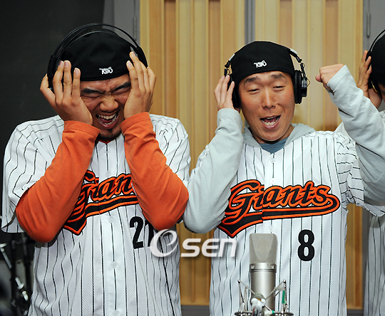 롯데 자이언츠는 25일 오전 10시 서울 마포구 망원동 TONE 스튜디오에서 앨범에 참여하는 가수와 선수가 모인 가운데 음반제작 발표회를 갖고 녹음과 뮤직비디오 일부를 촬영했다. 가수는 박상민, 노브레인, 가요톱텐, 쿨에이지, 슈가도넛, 자니로얄이고 정수근, 송승준, 장성우가 롯데 응원단과 함께 참여했다. 발표회가 끝난 뒤 정수근, 송승준이 녹음실에서 노래를 신나게 부르고 있다. /민경훈 기자 rumi@osen.co.kr