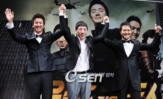 액션 코미디 영화 '유감스러운 도시' 제작보고회가 9일 서울 압구정 CGV에서 열렸다. 이 자리에는 김동원 감독과 주연배우 정준호 정웅인 김상중 박상민 김대희가 참석했다. 기자회견을 마치고 늦게 회견 장에 도착한 정운택과 함께 정웅인과 정준호가 포토타임을 갖고 있다./민경훈 기자rumi@osen.co.kr 온라인으로 받아보는 스포츠 신문, 디지털 무가지 OSEN Fun&Fun, 매일 3판 발행