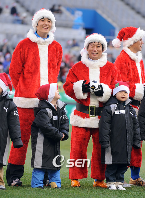 올해로 6회째를 맞는 홍명보 장학재단의 '하나은행과 함께 하는 SHARE THE DREAM FOOTBALL MATCH 2008'가 25일 오후 서울 상암월드컵경기장에서 열렸다. 경기 전 산타 복장을 한 기성용과 이수근이 환한 미소를 짓고 있다./상암=윤민호 기자ymh@osen.co.kr 온라인으로 받아보는 스포츠 신문, 디지털 무가지 OSEN Fun&Fun, 매일 3판 발행