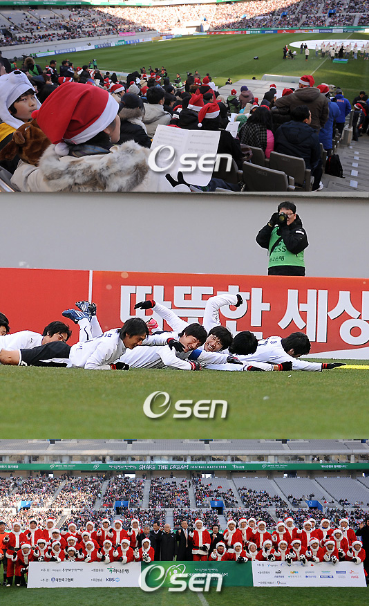 25일 오후 2시 서울 상암월드컵경기장에서 대한민국 최고의 전현역 축구스타들이 사랑과 희망의 골을 쏘아올리기 위해 한자리에 모였다. ▲ 꿈과 희망을 노래한 축구스타들 친선경기였으나 열정만큼은 뜨거웠다. 최용수, 황선홍, 고정운, 김도근, 윤정환, 홍명보, 김주성, 서정원 등 숱한 과거 명성을 날렸던 은퇴 스타들과 기성용, 이청용, 정조국, 조원희, 조재진 등의 현역 스타들의 활발한 움직임 속에 터진 골 속에 관중들은 함성으로 보답했다. ▲ 골만큼이나 빛난 세레모니 대부분 휴가 중임에도 불구하고 기꺼이 경기 출전을 약속한 선수들의 준비는 철저했다. 사랑팀의 선제골을 터트린 이호는 수영 세레모니를 펼쳤고 추가골을 기록한 정조국은 역도 세레모니로 관심을 돋구었다. 여기에 개그맨 이수근 또한 선수 못지 않은 움직임을 과시한 끝에 희망팀의 2번째 골을 터트리며 배영 세레모니로 관중들을 기쁘게 했다. 또한 기성용이 페널티킥을 성공시키자 희망팀 선수들이 모여 유니폼 속에 숨겼던 '메리크리스마스'라는 메시지를 전했다. ▲ 꿈과 희망으로 빛난 3만 산타 캐롤 대합창 이날 하프타임에는 경기 만큼이나 뜻깊었던 '3만 산타 캐롤 대합창'이 열렸다. 지난 2007년 11월 미국 시카고에서 1만 3900명이 합창한 기존 기록을 경신하겠다는 의도로 진행된 이 행사는 '에반젤리 장애어린이 합창단'과 관중들이 입을 모아 15분가량 열창하며 기네스북의 인증을 기다리게 됐다. stylelomo@osen.co.kr 온라인으로 받아보는 스포츠 신문, 디지털 무가지 OSEN Fun&Fun, 매일 3판 발행