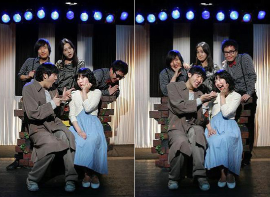 [리뷰] 카툰뮤지컬 ‘두근두근’ 대학로 단막극장 “두근두근” “콩닥콩닥” “화들짝” “우르르 쾅쾅” “화끈화끈” “뒤적뒤적” “긁적긁적” 배우들이 과장된 몸짓과 독특한 소리로 관객과 대화를 시도한다. 뮤지컬에 필요한 음악과 춤, 화려한 의상과 조명까지 관객과 소통하는 모든 것들이 작은 대학로 단막극장 카툰뮤지컬 ‘두근두근’ (연출 정세혁) 무대에 구비됐다. "세상에서 가장 무섭다"는 솔로의 외로움에 사무치는 한 남자가 있다. 운명처럼 한 여자를 만나서 짝사랑에 빠지고 이들의 사랑을 재미있게 무대에 올렸다. ‘두근두근’ 공연은 시작부터 독특하다. 객석 사이에 무심코 등장하는 버버리 맨, 무대 앞에 펼쳐진 허름한 담요에 퍼져 앉아 구멍 난 양말 사이 발가락을 만지작만지작 긁적긁적, 그 손가락으로 코를 후비고 핸드폰을 들었다 놨다 혼자 외롭게 텔레비전을 켠다. 그것도 잠시 관객은 무대에서 뭔가 부스럭거리는 지저분한 이 남자에게 주목할 틈이 없다. 공연시작을 알리는 탭 댄서의 요란한 등장과 함께 대학로 소극장에서 펼쳐진 ‘두근두근’의 무대는 여느 대형뮤지컬보다 열정적이다. 카툰뮤지컬 ‘두근두근’은 오직 의성어와 의태어로 이뤄졌다. 독특한 소리부터 귀에 익숙한 뮤지컬 넘버까지 모두 배우들의 입에서 소리가 난다. ‘두근두근’의 배우들은 팔방미인이다. 귀를 즐겁게 하는 아카펠라부터 탭 댄스 반주 속, 배우들의 독특한 음색까지 배우들의 열연 속에서 재미를 더했다. ‘두근두근’에 빠르게 전개되는 무대전환도 수동으로 만들어낸 배우들의 동작에서 이뤄진다. 이 모든 것들이 연출자 정세혁의 반짝이는 아이디어와 온 몸을 던져 연기하는 배우들의 노력에서 느낄 수 있는 매력들이다. ‘두근두근’은 ‘카툰’이라는 독특한 장르에서 시작해 뮤지컬 창작의 기쁨을 선사한다. 어설픈 대형뮤지컬과 “돈 좀 들였다”는 라이선스 뮤지컬보다 더 즐겁고 흥겨운 창작뮤지컬이다. 잠시도 쉴 틈 없이 돌아가는 배우들의 연기는 무대와 객석의 경계를 없애는 동시에 관중의 호응을 끌어내고 식상할 수 있는 메인스토리를 코믹하게 극대화 시켰다. jin@osen.co.kr 카툰 뮤지컬 ‘두근두근’ 공연.