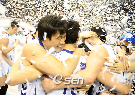 'NH농협 2008-2009 V-리그' 삼성화재와 현대캐피탈의 챔피언결정전 4차전이 12일 오후 대전 충무체육관에서 벌어졌다. 이 날 삼성화재는 5세트까지 가는 접전 끝에 세트 스코어 3-2(18-25 25-20 19-25 25-20 15-13)로 역전승, 3승 1패로 한국 프로배구 최초 V3를 달성했다. 삼성화재 선수들이 종이 꽃비를 맞으며 기쁨을 나누고 있다./대전=민경훈 기자 rumi@osen.co.kr