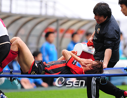 FC 서울의 공격수 정조국(25)의 광대뼈 함몰 부상의 악몽이 재현되는 것일까. 정조국은 2일 오후 5시 서울월드컵경기장서 열린 2009 K리그 8라운드 성남과 경기서 데얀과 투톱으로 선발 출장했으나 전반 6분 왼쪽 측면서 김치우가 올려준 크로스를 받는 과정에서 상대 수비수 장학영과 충돌해 그라운드에 쓰러졌다. 터치라인 밖으로 빠져나온 정조국은 왼쪽 광대뼈를 움켜쥐고 일어서지 못했고 서울의 의료진은 벤치 쪽을 향해 계속해서 출전이 불가능하다는 표시를 보냈다. 서울은 전반 11분 정조국을 대신해 이승렬을 투입했으며, 정조국은 부축을 받으며 선수 입장 터널로 빠져나갔다. 지난해 10월 4일 인천과 경기에서 광대뼈 3곳이 함몰되는 큰 부상을 당해 수술대에 올랐던 정조국은 플레이오프 울산전과 챔피언결정전 수원과의 경기에 나서며 불굴의 의지를 불태운 바 있다. 그러나 여전히 후유증이 남아 있는 것으로 알려졌으며 부상 정도는 아직 확인되지 않았다. parkrin@osen.co.kr