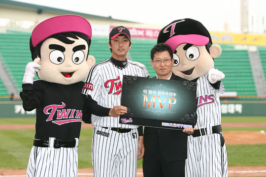 '미남 투수' 심수창(28. LG 트윈스)이 구단 선정 4월 최우수선수(MVP)로 꼽혔다. 올시즌 팀의 3선발로 활약 중인 심수창은 2일 잠실 히어로즈전을 앞두고 LG 구단과 제휴를 맺은 모바일 게임 업체 지오인터랙티브㈜(대표 김동규, http://www.clubzio.com) 이진석 부사장으로 부터 50만원 상당의 상품권을 전달받았다. 심수창은 지난 4월 한 달간 2승 2패 평균 자책점 4.11을 기록하며 제 몫을 했다. 특히 그는 지난 4월 29일 벌어진 청주 한화 전에 선발 등판, 7⅓이닝 6피안타 2실점으로 호투하며 1경기 개인 최다이닝을 기록하며 호투 한 바 있다. farinelli@osen.co.kr LG 트윈스 제공.