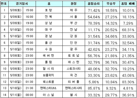 [축구토토] 국내 축구팬들은 이번 주말 프리미어리그 맨체스터유나이티드(이하 맨유)와 맨체스터시티(이하 맨시티)의 경기에서 맨유의 낙승을 예상했다. 스포츠토토 온라인 발매사이트인 베트맨(www.betman.co.kr)은 오는 9일부터 11일 새벽(한국시간)까지 벌어지는 K-리그 7경기와 잉글랜드 프리미어리그 7경기 등 총 14경기를 대상으로 한 축구토토 승무패 17회차 투표율 중간집계 결과 프리미어리그 맨유-맨시티전에서 축구팬 85.87%가 홈팀 맨유의 승리를 예상했다고 밝혔다. 반면 원정팀 맨시티의 승리 예상은 4.81%였으며 두 팀의 무승부 예상 역시 9.32%에 그쳤다. 지난 아스날과의 챔피언스리그 준결승 원정 경기에서 박지성의 선제 골을 포함해 3-1 승리를 거두고 상승세를 이어가고 있는 맨유가 승점 3점차로 뒤를 바짝 쫓고있는 리버풀의 추격을 어떻게 따돌릴 수 있을 지가 흥미롭다. 또한 런전 라이벌 팀인 아스날과 첼시전에서는 첼시의 승리를 예상한 축구팬들이 36.91%로 아스널 승리 33.32%, 무승부 29.77%를 근소하게 앞서 두 팀 모두 치열한 승부를 벌일 것으로 예상했다. 이밖에 축구팬들은 K-리그 포항-제주, 전북-서울, 성남-부산전에서 포항 승리(71.42%), 전북 승리(54.64%), 성남 승리(78.39%) 등의 가능성을 각각 높게 예상했다. 한편, 이번 축구토토 승무패 17회차는 9일 오후 2시 50분에 발매 마감되며 모든 경기가 종료된 11일 결과가 공식 발표된다. '즐거운 스포츠, 즐거운 토토'(http://www.betman.co.kr)