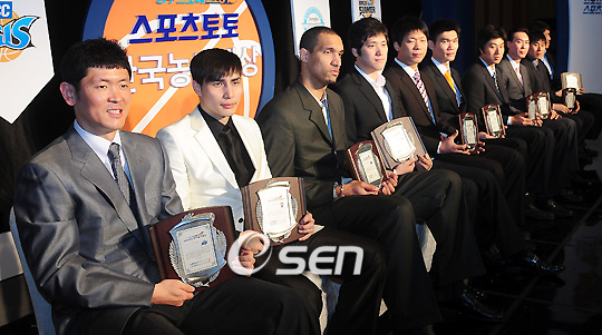올해로 2회째를 맞은 '스포츠조선 제정 스포츠토토 한국농구대상' 시상식이 8일 오전 서울 소공동 웨스틴조선호텔 그랜드볼룸에서 열렸다. 시상식은 MVP(최우수선수)와 우수선수상, 신인상, 외국인선수상, 식스맨상, 감독상, 베스트5, 기록부문, 공로상, 클린팀상, 심판상, 인기상, 기량발전상, 우수프런트상, 응원상 등 총 25개 부문에 걸쳐 시상한다 수상자들이 기념촬영을 하고 있다./윤민호 기자ymh@osen.co.kr