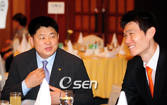 올해로 2회째를 맞은 '스포츠조선 제정 스포츠토토 한국농구대상' 시상식이 8일 오전 서울 소공동 웨스틴조선호텔 그랜드볼룸에서 열렸다. 시상식은 MVP(최우수선수)와 우수선수상, 신인상, 외국인선수상, 식스맨상, 감독상, 베스트5, 기록부문, 공로상, 클린팀상, 심판상, 인기상, 기량발전상, 우수프런트상, 응원상 등 총 25개 부문에 걸쳐 시상한다 시상식에 참석한 강동희 신임 동부 감독과 김주성이 대화를 나누며 미소 짓고 있다./윤민호 기자ymh@osen.co.kr