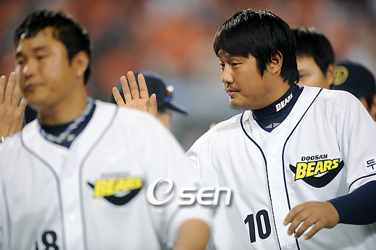 '2009 CJ 마구마구 프로야구' 두산 베어스와 한화 이글스의 경기가 8일 오후 잠실구장에서 벌어졌다. 3회말 2사 2,3루 최준석의 결승타와 선발 홍상삼의 5이닝 2실점 쾌투에 힘입어 6-2로 승리했다. 두산은 이날 승리로 4연패를 끊는 동시에 시즌 전적 14승 2무 11패(8일 현재)를 기록하게 되었다. 반면 6위(11승 2무 14패) 한화는 4연패를 이어갔다. 최준석이 동료선수들과 승리를 자축하고 있다./잠실=윤민호 기자ymh@osen.co.kr