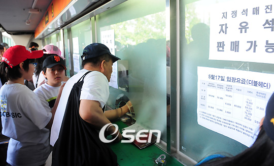 '2009 CJ 마구마구 프로야구' 롯데 자이언츠와 한화 이글스의 시즌 첫 더블헤더 경기가 17일 오후 부산 사직구장에서 벌어진다. KBO는 올 시즌부터 주말전 때 우천 최소된 경기 가운데 한 경기를 '월요일 경기'로 치르는 제도를 도입했다가 현장 감독들의 반말로 지난 14일 월요일 경기를 없애고 더블헤더로 대체했다. 최근 더블헤더 경기는 2006년 10일 1일 광주 KIA-롯데 전이였다. 야구팬들이 첫 더블헤더 경기를 보기 위해 입장권을 구매하고 있다./부산=윤민호 기자ymh@osen.co.kr