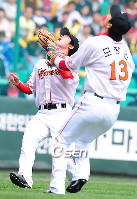 '2009 CJ 마구마구 프로야구' SK 와이번스와 KIA 타이거즈의 더블헤더 첫 경기가 17일 문학야구장에서 벌어졌다. KBO는 올 시즌부터 주말 경기때 우천 취소된 경기 가운데 한 경기를 월요일에 치르는 제도를 도입했다가 현장 감독들의 반발로 지난 15일 주말 경기 부터 월요일 경기를 없애고 더블헤더로 대체했다. 더블헤더는 2006년 10월 1일 광주에서 KIA-롯데 전 이후 3년여 만에 벌어졌다. 2회초 1사 3루 나지완의 내야 뜬공을 SK 3루수 최정과 1루수 모창민이 서로 잡으려 달려가고 있다./손용호 기자spjj@osen.co.kr