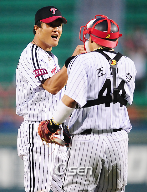 '2009 CJ 마구마구 프로야구' LG 트윈스와 SK 와이번스의 경기가 14일 오후 잠실구장에서 벌어졌다. 이 날 경기에서 LG는 선발 심수창의 호투와 7회 상대 좌완 투수 고효준의 폭투에 편승해 결승점을 뽑는 행운까지 겹치며 SK에 5-3으로 승리를 거뒀다. 경기를 마치고 LG 세이브투수 이재영과 조인성 포수가 기쁨을 나누고 있다./잠실=민경훈 기자 rumi@osen.co.kr