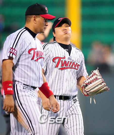 '2009 CJ 마구마구 프로야구' LG 트윈스와 SK 와이번스의 경기가 14일 오후 잠실구장에서 벌어졌다. 이 날 경기에서 LG는 선발 심수창의 호투와 7회 상대 좌완 투수 고효준의 폭투에 편승해 결승점을 뽑는 행운까지 겹치며 SK에 5-3으로 승리를 거뒀다. 경기를 마치고 LG 이진영이 묘한 표정을 짓고 있다./잠실=민경훈 기자 rumi@osen.co.kr