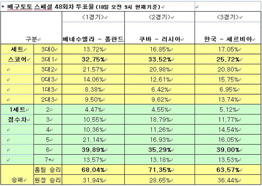 [배구토토] 국내 배구팬들은 2009 월드리그 한국-세르비아전에서 한국의 승리를 점쳤다. 스포츠토토 공식 온라인 발매사이트인 베트맨(www.betman.co.kr)은 오는 20일 치러지는 2009 월드리그 베네수엘라-폴란드, 쿠바-러시아, 한국-세르비아전 등 3경기를 대상으로 한 배구토토 스페셜 48회차 게임 투표율 중간집계 결과 3경기 한국-세르비아전에서 홈팀 한국의 승리에 63.57%가 투표해 다수의 배구팬들이 홈팀 한국의 승리를 예상한 것으로 나타났다고 밝혔다. 배구토토 스페셜은 게임은 더블(2경기 대상) 및 트리플(3경기 대상) 등 두 가지 방식으로 진행되며 각 경기의 최종세트스코어와 1세트 점수차를 예상하면 된다. 최종세트스코어는 3:0, 3:1, 3:2, 0:3, 1:3, 2:3 등 6개 항목으로 구성되며 1세트 점수차 표기방식은 2점차, 3점차, 4점차, 5점차, 6점차, 7점차 이상 등 6가지로 구분된다. 한국-세르비아전 최종 세트스코어는 한국의 3-1 승리(25.72%)와 3-2 승리(20.80%)를 예상한 참가자가 많았다. 1세트 점수차의 경우 6점이 39.00%로 가장 많았고 5점이 16.05%로 그 뒤를 이었다. 1경기 베네수엘라-폴란드전도 홈팀 베네수엘라의 승리에 68.04%의 참가자가 투표했다. 최종 세트스코어로는 베네수엘라의 3-1 승리 32.75%와 3-2 승리 21.57%를 점친 참가자가 많았다. 1세트 점수차는 6점이 39.89%로 가장 많았고 5점 21.14%가 그 뒤를 이었다. 2경기 쿠바-러시아전은 홈팀 쿠바의 승리에 71.35%의 참가자가 투표했다. 최종 세트스코어로는 쿠바의 3-1 승리 33.52%와 3-2 승리 20.98%를 점친 참가자가 많았다. 1세트 점수차는 6점이 35.29%로 가장 많았고 3점 18.79%가 그 뒤를 이었다. 한편 이번 배구토토 스페셜 48회차 게임은 19일 오후 10시에 발매 마감된다. '즐거운 스포츠, 즐거운 토토'(http://www.betman.co.kr)