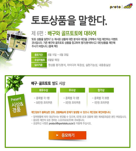 [스포츠 토토] 스포츠토토가 토토 상품에 대한 평가에 대한 보답으로 푸짐한 경품을 증정하는 이벤트를 마련한다. 체육진흥투표권 수탁사업자인 스포츠토토(www.sportstoto.co.kr)는 현재 시행되고 있는 토토 상품에 대해 평가하고 바람직한 대안을 제시하는 '토토 상품을 말한다' 이벤트를 오는 20일까지 홈페이지를 통해 실시한다고 밝혔다. 이번 평가 대상으로 선정된 상품은 현재 국내외 프로골프 대회를 대상으로 시행되고 있는 '골프토토 스페셜' 게임과 국내외 배구대회 경기결과를 예상하는 배구토토 게임이다. 골프토토는 지정선수 4명 또는 6명의 1라운드 최종 타수구간을 예상하는 스페셜 게임과 14명을 7개조로 나눠 각 조별 승무패를 알아맞히는 승무패 게임 등 두가지 방식으로 진행된다. 배구토토는 1경기를 대상으로 3세트까지 승리 팀과 세트별 득실차를 예상하는 매치 게임과 3경기를 대상으로 최종 세트스코어와 1세트 점수차를 맞히는 스페셜 게임으로 나뉜다. 이번 '토토 상품을 말한다' 이벤트에 참여하려면 스포츠토토 및 공식 발매사이트인 베트맨(www.betman.co.kr)에 마련된 이벤트 페이지에 접속한 후 골프토토와 배구토토 상품에 대해 구체적으로 평가하고 진단한 후 대안 아이디어를 자유롭게 제시하면 된다. 심사 기준은 △현 상품에 대한 평가와 진단 △대안 아이디어의 독창성 △실현 가능성 △내용 충실성 등으로 구분된다. 각 종목별로 가장 우수한 의견을 제시한 최우수상 1명에게는 50만원 상당의 스포츠토토 프리쿠폰이 지급된다. 또 종목별 우수상 5명에게는 프리쿠폰 5만원씩, 참가상 20명에게는 프리쿠폰 1만원씩 돌아간다. '토토 상품을 말한다' 이벤트 안내 화면. '즐거운 스포츠, 즐거운 토토'(http://www.betman.co.kr)