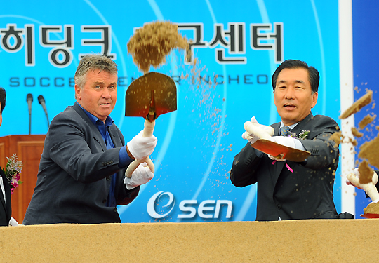 방한 중인 거스 히딩크(63) 러시아대표팀 감독이 30일 오전 2014년 아시안게임 주경기장 신축 현장인 인천시 서구 경서동서 '인천 히딩크 축구센터' 기공식에 참석했다. 인천 히딩크 축구센터는 2010년 말 완공을 목표로 천연잔디구장 4면, 인조잔디구장 1면, 시각장애인 전용구장인 히딩크 드림필드 1면 등 6개 구장과 함께 교육동, 스포츠재활센터, 숙소 등이 조성된다. 인천히딩크축구센터는 이르면 9월부터 인천유나이티드의 유소년 축구센터인 서구와 연수구 아카데미를 활용해 운영을 시작한 뒤 2011년부터 본격 가동에 들어갈 예정이다. 시공식에 참석한 히딩크 감독이 안상수 인천시장과 시삽 기념 행사를 갖고 있다./인천=윤민호 기자ymh@osen.co.kr