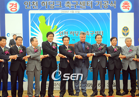 방한 중인 거스 히딩크(63) 러시아대표팀 감독이 30일 오전 2014년 아시안게임 주경기장 신축 현장인 인천시 서구 경서동서 '인천 히딩크 축구센터' 기공식에 참석했다. 인천 히딩크 축구센터는 2010년 말 완공을 목표로 천연잔디구장 4면, 인조잔디구장 1면, 시각장애인 전용구장인 히딩크 드림필드 1면 등 6개 구장과 함께 교육동, 스포츠재활센터, 숙소 등이 조성된다. 인천히딩크축구센터는 이르면 9월부터 인천유나이티드의 유소년 축구센터인 서구와 연수구 아카데미를 활용해 운영을 시작한 뒤 2011년부터 본격 가동에 들어갈 예정이다. 기공식서 히딩크 감독이 참석자들과 기념촬영을 하고 있다./인천=윤민호 기자ymh@osen.co.kr