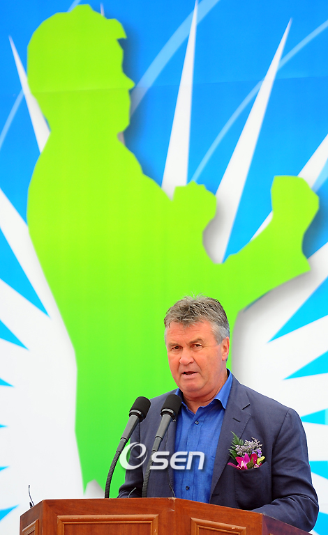 방한 중인 거스 히딩크(63) 러시아대표팀 감독이 30일 오전 2014년 아시안게임 주경기장 신축 현장인 인천시 서구 경서동서 '인천 히딩크 축구센터' 기공식에 참석했다. 인천 히딩크 축구센터는 2010년 말 완공을 목표로 천연잔디구장 4면, 인조잔디구장 1면, 시각장애인 전용구장인 히딩크 드림필드 1면 등 6개 구장과 함께 교육동, 스포츠재활센터, 숙소 등이 조성된다. 인천히딩크축구센터는 이르면 9월부터 인천유나이티드의 유소년 축구센터인 서구와 연수구 아카데미를 활용해 운영을 시작한 뒤 2011년부터 본격 가동에 들어갈 예정이다. 시공식에 참석한 히딩크가 기념사를 하고 있다./인천=윤민호 기자ymh@osen.co.kr