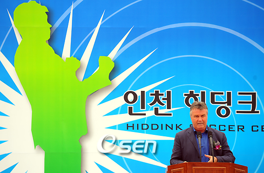 방한 중인 거스 히딩크(63) 러시아대표팀 감독이 30일 오전 2014년 아시안게임 주경기장 신축 현장인 인천시 서구 경서동서 '인천 히딩크 축구센터' 기공식에 참석했다. 인천 히딩크 축구센터는 2010년 말 완공을 목표로 천연잔디구장 4면, 인조잔디구장 1면, 시각장애인 전용구장인 히딩크 드림필드 1면 등 6개 구장과 함께 교육동, 스포츠재활센터, 숙소 등이 조성된다. 인천히딩크축구센터는 이르면 9월부터 인천유나이티드의 유소년 축구센터인 서구와 연수구 아카데미를 활용해 운영을 시작한 뒤 2011년부터 본격 가동에 들어갈 예정이다. 시공식에 참석한 히딩크가 기념사를 하고 있다./인천=윤민호 기자ymh@osen.co.kr
