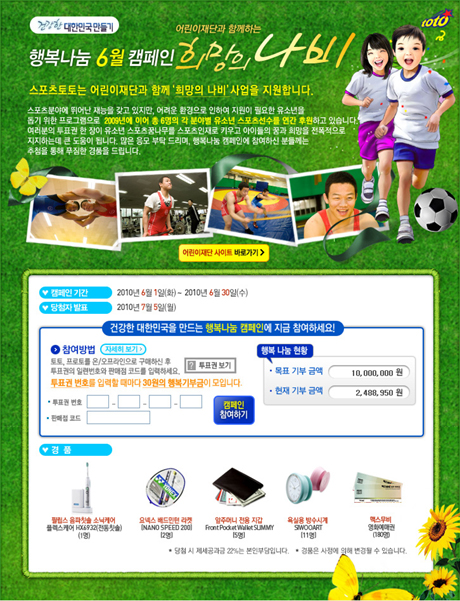 이번 실시되고 있는 행복나눔 6월 캠페인은 스포츠토토가 어린이재단과 함께 '희망의 나비 사업'을 지원할 예정으로 지난 1일부터 시작된 캠페인은 7일 오전 현재 총 248만 8950원의 금액이 기부되어 토토 참가자들의 뜨거운 사랑의 열기가 그대로 전해지고 있다.