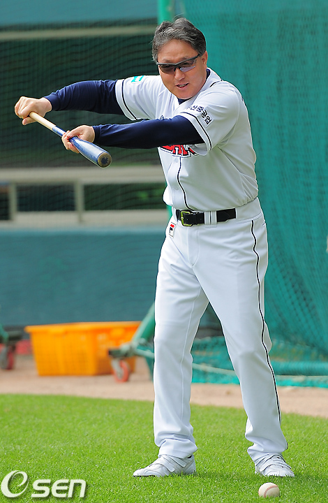 경기전 두산 김경문 감독이 번트연습을 지켜보며 코치하고 있다. /jpnews@osen.co.kr