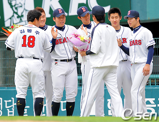 경기전 5월 MVP로 선정된 두산 김동주 김선우를 동료선수들이 축하해 주고 있다. /jpnews@osen.co.kr
