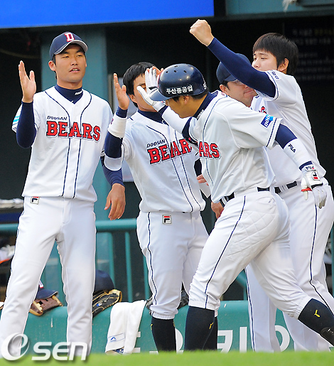 1회말 1사 1루에서 두산 김현수가 투런홈런을 날리고 덕아웃에서 동료선수들의 축하를 받고 있다. /jpnews@osen.co.kr