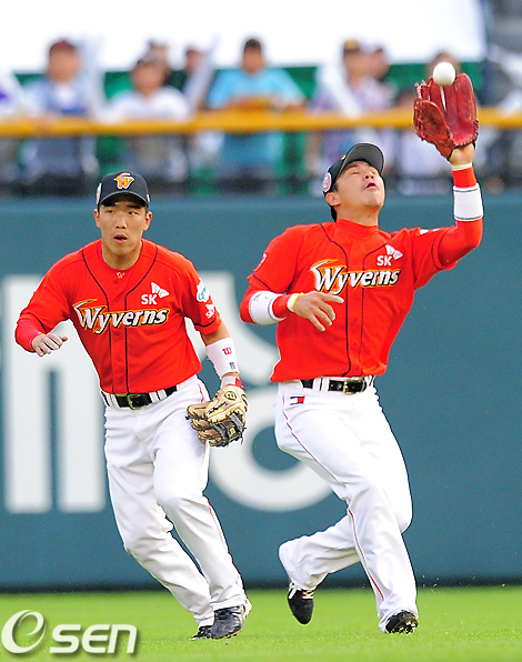 2회말 1사 1루에서 두산 양의지의 외야플라이 타구를 SK 김강민이 정근우를 피해 포구하고 있다. /jpnews@osen.co.kr