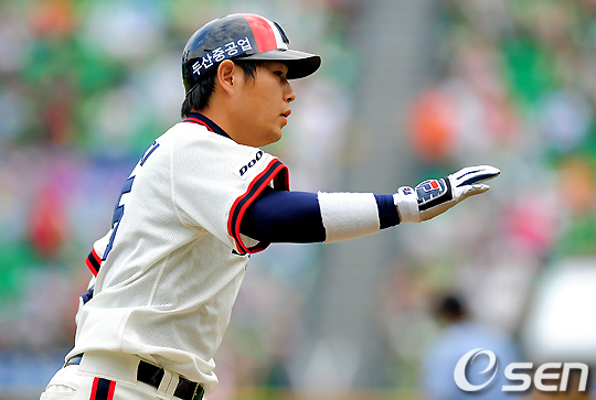 첫 득점은 두산 안방마님 양의지의 방망이에서 터졌다. 2회말 2사 후 두산은 손시헌이 풀카운트까지 가는 끝에 상대 선발 카도쿠라 겐으로부터 볼넷으로 골라 출루하며 분위기를 끌어올렸다. 뒤를 이은 양의지는 볼카운트 0-1에서 2구 째 직구(144km)를 그대로 받아쳤다. 이는 우중간 담장을 넘기는 선제 투런으로 이어졌다.