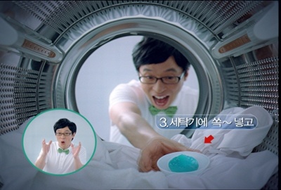 제품의 시연장면은 하단 원 속 유재석의 친절한 설명까지 더해진다. 리큐식 세탁과정을 유재석이 유쾌하고 신나게 설명해 준다.